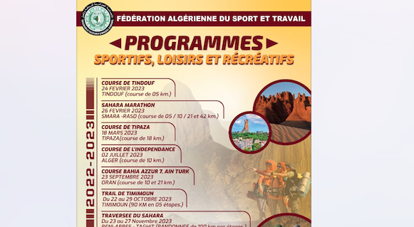 نشرت الصفحة الرسمية للإتحادية الجزائرية للرياضة والعمل برنامجها الخاص لسنة 2023، والذي سينطلق في ال 24 من شهر فيفري المقبل بسباق تيندوف على مسافة 05 كلم، يليه ماراطون الصحراء في ال 26 من نفسر الشهر والذي سيقسم على أربعة مراحل الأولى على مسافة 05 كلم، ثم 10 كلم، ثم 21 كلم أما المرحلة الرابعة والأخيرة فستكون على مسافة 05 كلم.