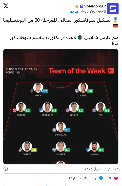 وصنف موقع “صوفاسكور” المتخصص في الإحصائيات، شايبي ضمن تشكيلة الأسبوع لـ”البوندسليغا” بعد أن نال تنقيط 8.3 في هذه الجولة.