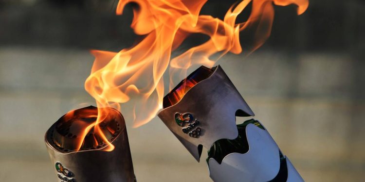 وتم إضاءة الشعلة التقليدية يوم 16 أفريل في الموقع الأثري القديم في أولمبيا بشبه جزيرة بيلوبونيز اليونانية.