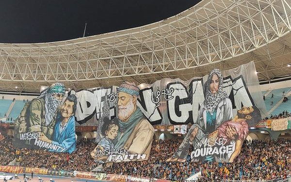 واستعرضت جماهير الترجي لوحات “تيفو” بعنوان “صنع في غزة” جسدت من خلالها صمود ومعاناة سكان القطاع الفلسطيني.