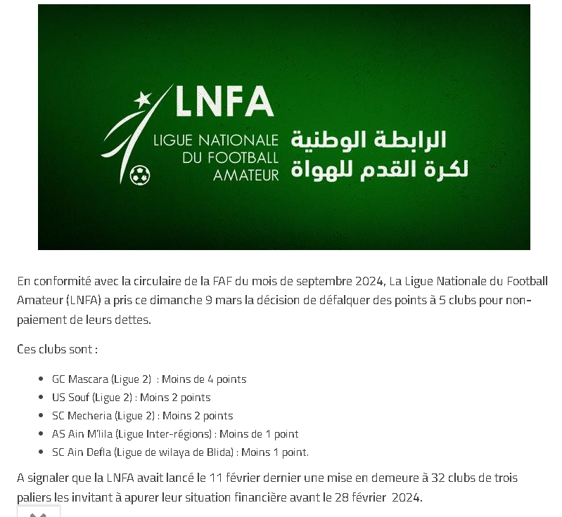 أعلنت رابطة الهواة، عبر موقعها الرسمي عبر الأنترنت عن خصم نقاط من رصيد خمسة أندية لِكرة القدم تنتمي إلى أقسام متباينة، بِسبب عدم تسديدها للديون.