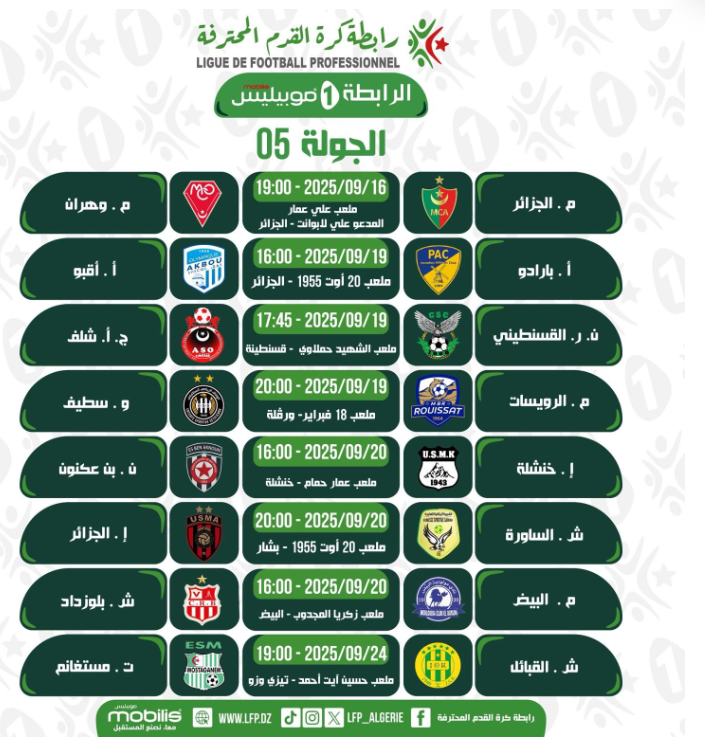 أعلنت الرابطة المحترفة لكرة القدم عن تواريخ وتوقيت مباريات الجولة الخامسة من المحترف الأول.